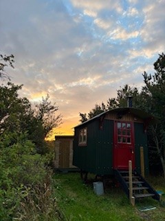 The Shepherd’s Hut is located in a secluded spot, just a 5 minute walk from the HQ caravan and car park. The hut is very snug, with a comfy double bed and a cosy log burner. The hut comes well-equipped with kitchen equipment. An induction hob can be used for cooking, which is plugged into a power station (there’s no mains electricity). There is a hut at the back which provides plenty of storage space, as well as a composting toilet (there’s no mains water).